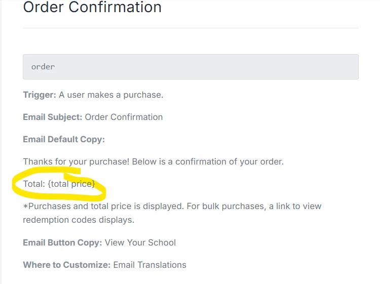 Can anyone help me with editing the circled text on the order confirmation email? We’d like to edit it to include pretax amount, tax amount and total amount - so it’s a much clearer and acceptable “receipt” from TI. I found most of the email in Translations, but that line only include the word “Total:” & not the {total price}