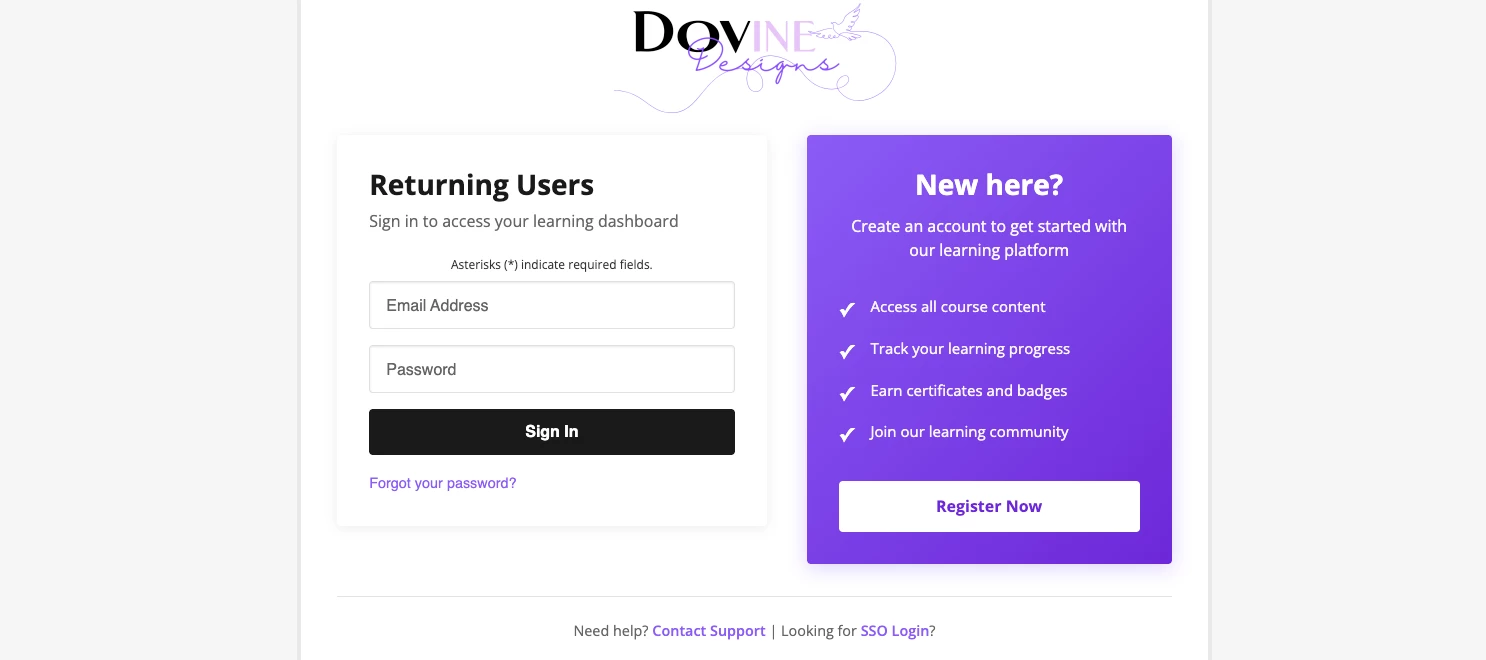 [INSERT_SSO_URL]→ replace with your actual SSO URL/learn/sign_up→ replace if your sign-up path differs- Brand text (“Your Academy”) → replace with your brand