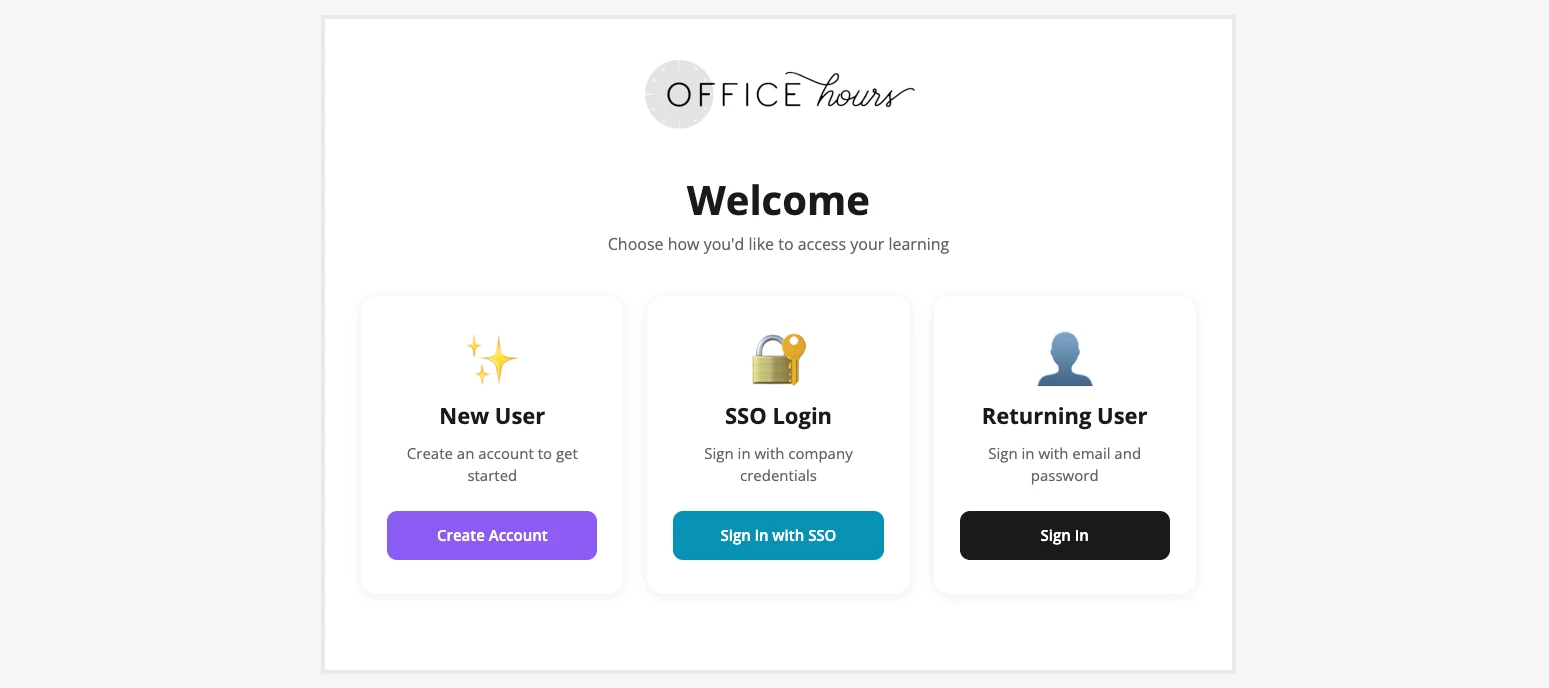 When to Use: When you have exactly three login paths that are equally important and should be visible at the same time, typically New Users, Returning Users, and SSO Login.